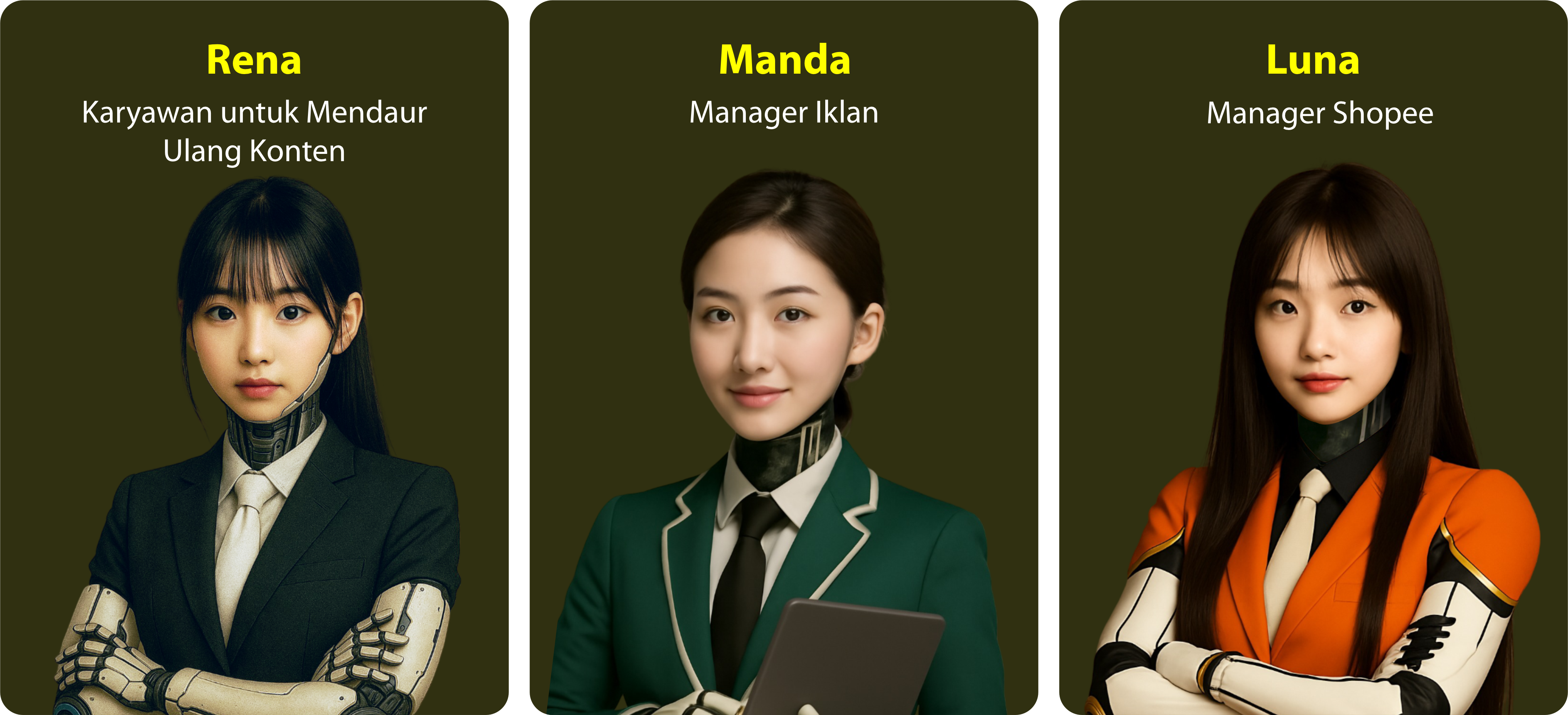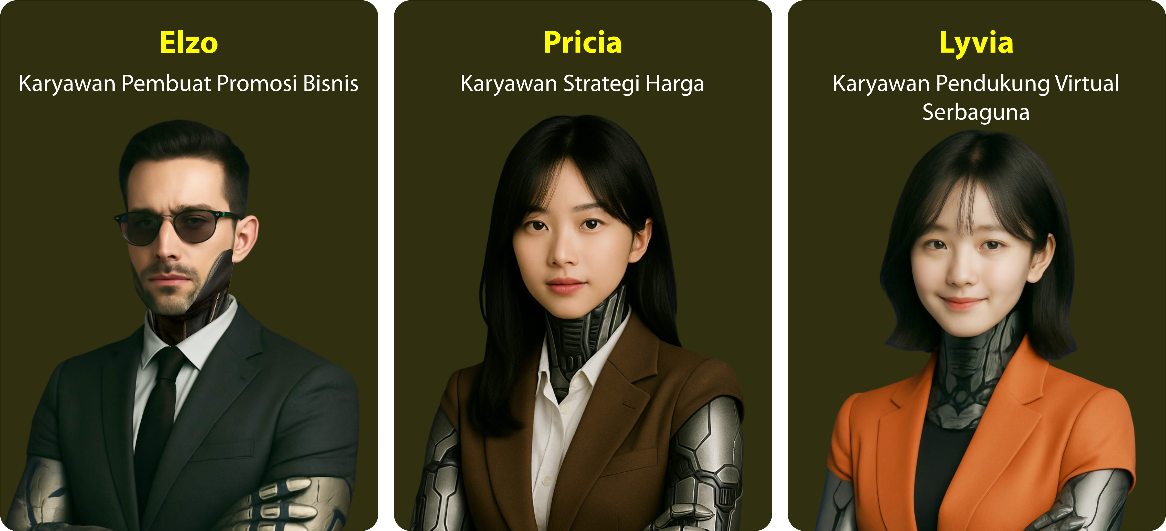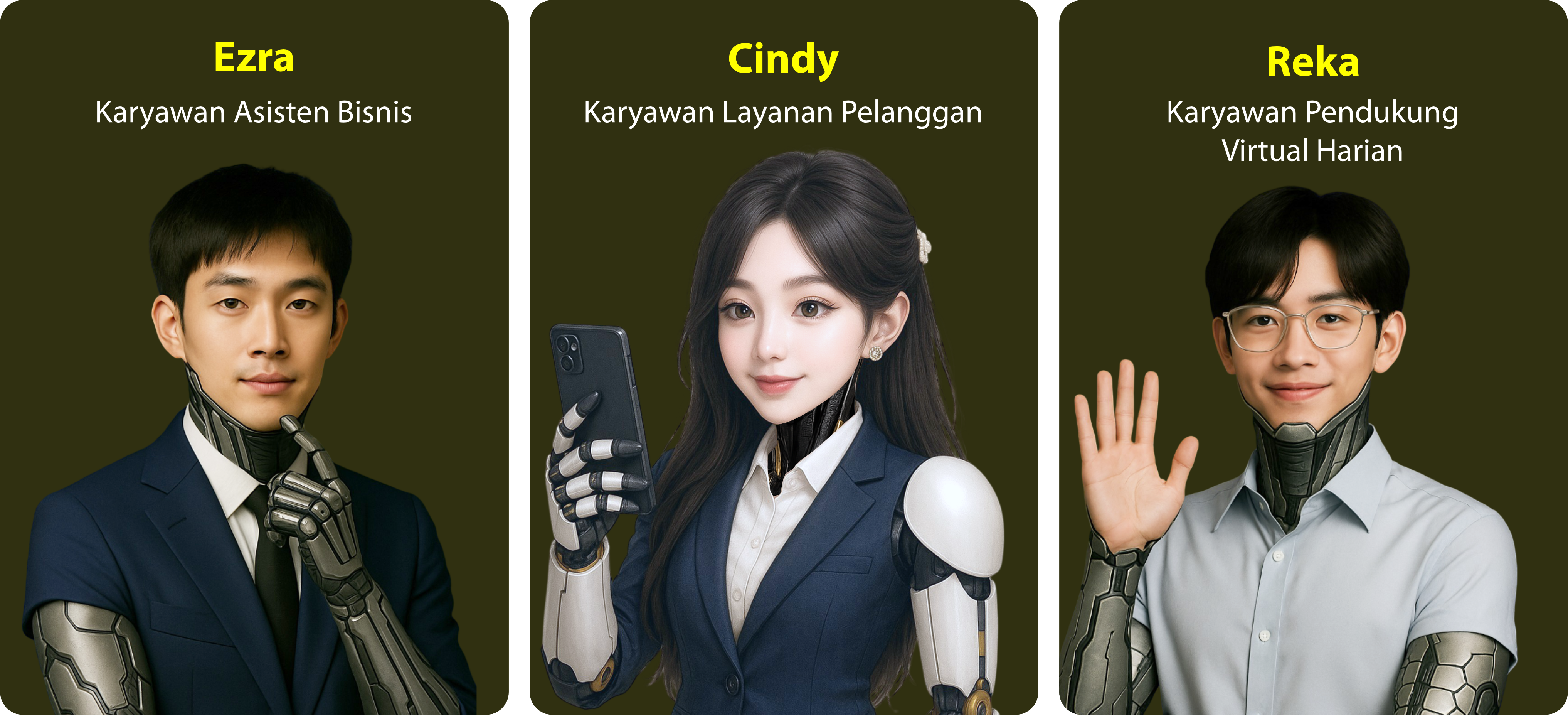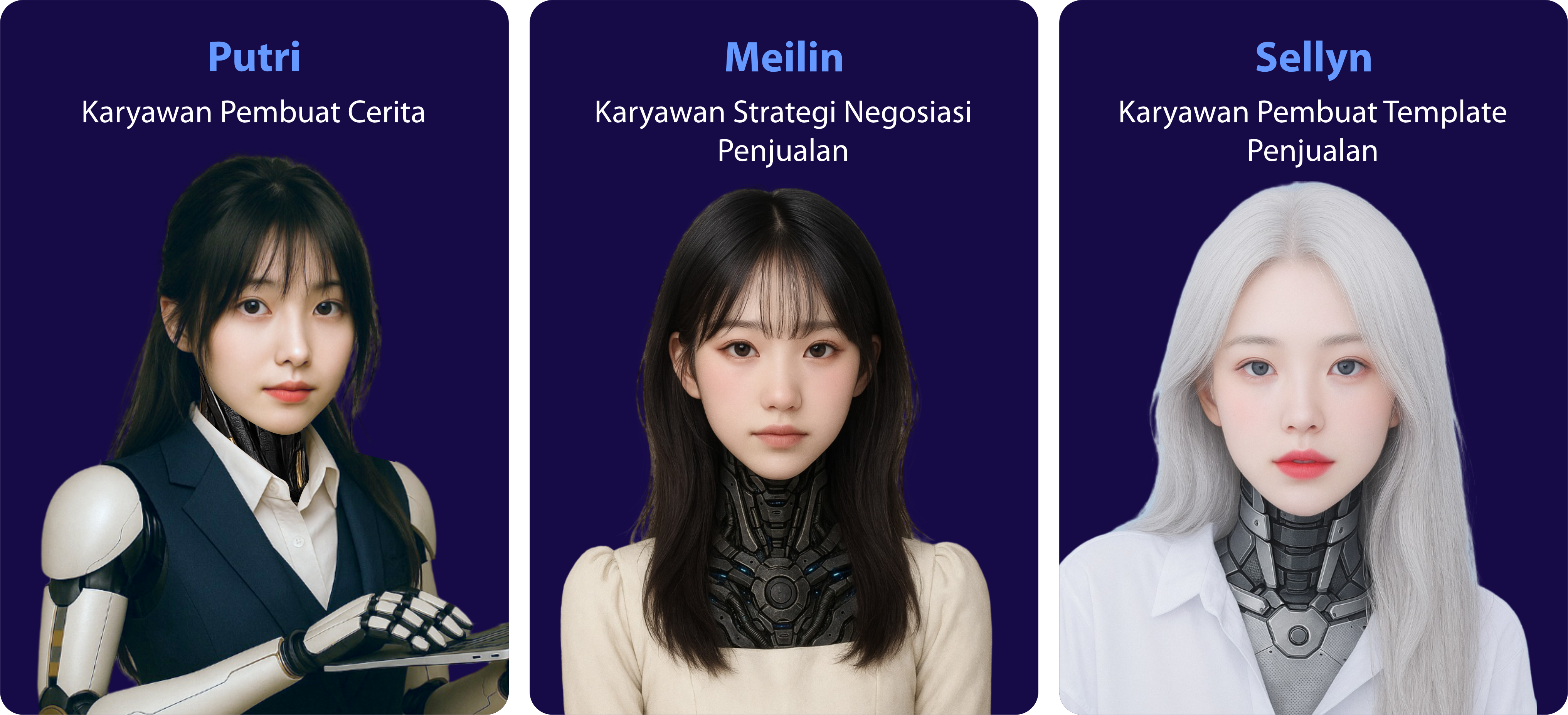 Karyawan Pintar yang memiliki spesialis masing-masing, yang dirancang dengan cermat oleh para ahli AI untuk menangani fungsi bisnis tertentu. Dengan Karyawan Pintar, kamu bisa menyerahkan tugas-tugas bisnis yang rumit ke "ahli AI" yang sudah terlatih di bidangnya masing-masing — semua bisa diakses lewat tampilan yang simpel dan gampang dipakai.
